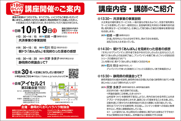 内容 | 13:30〜 共済事業の事業説明 14:30〜 朝ドラ「あんぱん」を見終わった信者の感想 15:30〜 静岡県の県議会って? 17:30~ 懇親会(参加希望者のみ ※事前申込必須) ※講座は全部でも1つだけでも希望のものだけの参加でOK🆗 |